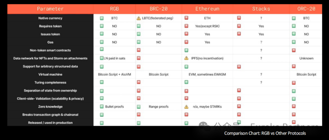 就目前而言,市场普遍认为 RGB 协议,Taproot 以及基于 BitVM 实现的方案是目前较为主流的扩容方案,大部分协议都在致力于可以在不修改 BTC 整体架构的前提下实现对 BTC 生态的扩展。相比于 备受投资机构热捧的 BitVM 受限于当前 BTC 基础设施仍很匮乏,落地实现难度很大,发布计划遥遥无期,RGB 协议则已经开始发力,吸引越来越多的项目加入其生态建设中。因 RGB 协议构建在闪电网络之上,使得 RGB 协议不仅很好地继承了闪电网络的优点,同时还通过客户端验证的技术来支持智能合约的实现。相较于其它铭文协议以及非 BTC 原生协议如 Stacks、Rootstock 等,RGB 协议不仅可以支持 BTC 原生资产和智能合约来扩展 BTC 生态,同时还可以支持闪电网络资产和 Lapps,从而构建出一个巨大的 BTC 生态系统。