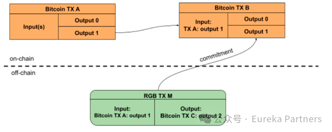 在 RGB 的某个合约中,创世代币都归属于一个比特币 UTXO(无论是已经存在的,还是临时创建的),而为了转移代币,你需要花费此 UTXO。在花费这个 UTXO 的时候,比特币交易必须额外添加一个输出,该输出包含对一条消息的承诺,这条消息的内容就是 RGB 的支付信息,它定义了输入、这些代币将被发送到哪个 UTXO、资产的 id、数量、花费的交易以及其它需要附加的数据。如果你有一笔归属于比特币交易 A 的 #1 输出的代币,要转移这些代币你就需要创建一笔 RGB 交易以及一笔花费交易 A 的 #1 输出的比特币交易,并且这笔比特币交易承诺了 RGB 交易。如你所见,RGB 交易是把代币从比特币交易 A 的 #1 输出转移到比特币交易 C 的 #2 输出(这笔交易在图中没有表现出来),而不是转移给比特币交易 B。在大部分情况下,我们可以预期交易 B 的 #0 输出就是找零地址,为的是在减去矿工手续费后将剩余资金发回给原来的所有者;同时 #1 输出是为了承诺 RGB 交易,以避免重复花费。