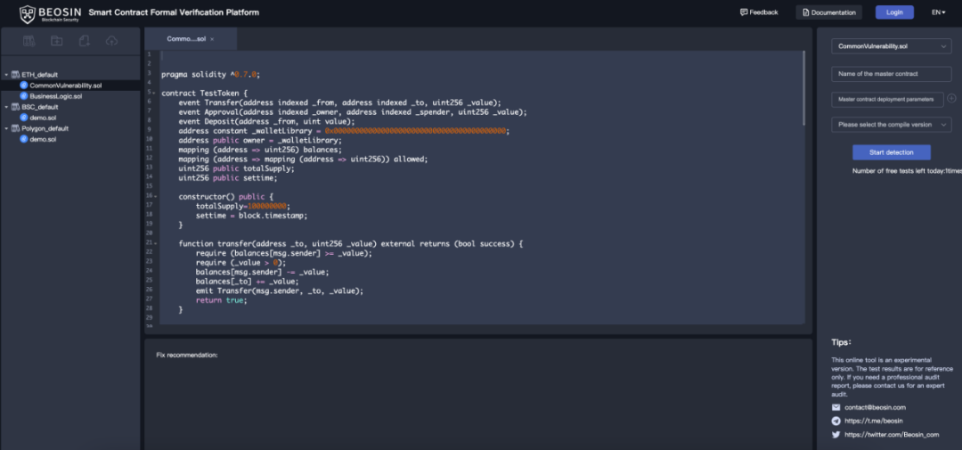 本次我们将通过Beosin VaaS工具扫描ERC404 v2的合约,结合Beosin安全专家的分析,对v2的合约代码进行解读,为ERC404协议相关的项目方提供安全建议: