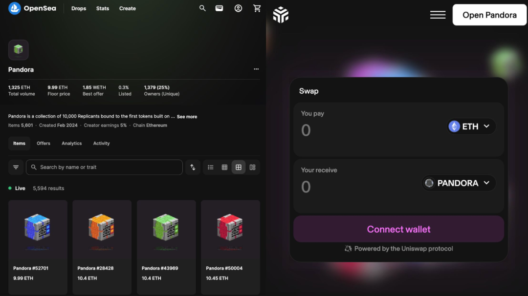 当用户在Uniswap上购买PANDORA代币后,此时你持有1个 PANDORA 代币就相当于同时也持有了 1 个 Pandora NFT,后续可以选择卖出PANDORA代币或是去OpenSea等NFT交易市场卖出Pandora NFT。用户先购买Pandora NFT,再选择去DEX卖出 PANDORA 代币也是同样可以的。