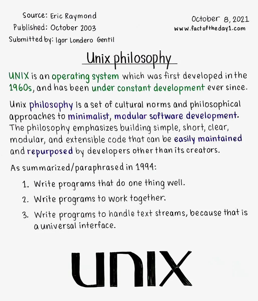 Unix 的理念是:1) 让每个程序做好一件事,2) 让每个程序的输出成为另一个程序的输入,3) 编写程序让其协同工作。如何使用此定律:构建模块化软件!