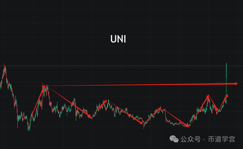 UNI从打破底部区间的那一刻,预示着后面的走势不可能只是昨天的53% 涨幅的那一笔,这是由一笔完成,只需要吃第二笔就行,不吃第三笔,因为危险均在3。uni热则带动整个去中心化板块的热,有望引领一波。