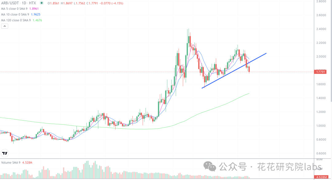 arb局部震荡向上走势破位,结构上预计会有一波调整,如果能回踩到120日均线附近,大胆买进!