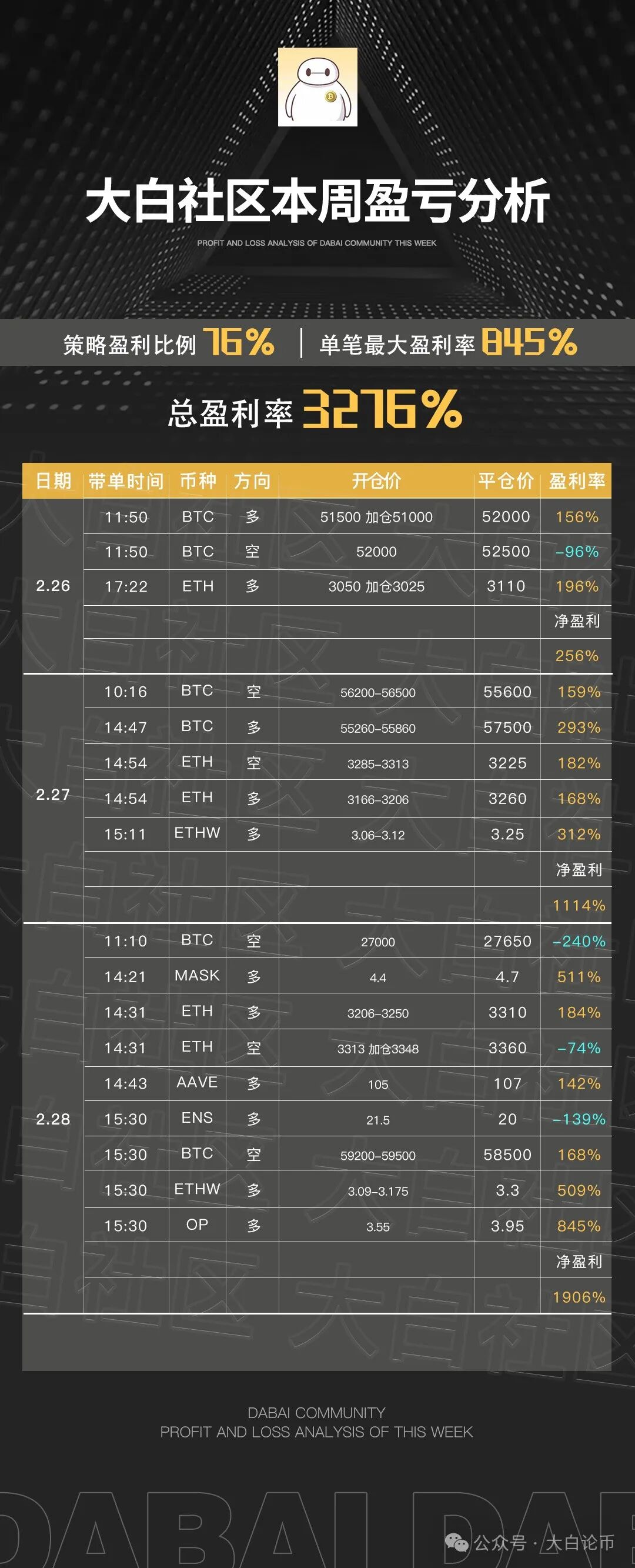 下方是大白社区本周实盘群单子,恭喜跟上的币友,如果你操作不顺,可以来试试水。