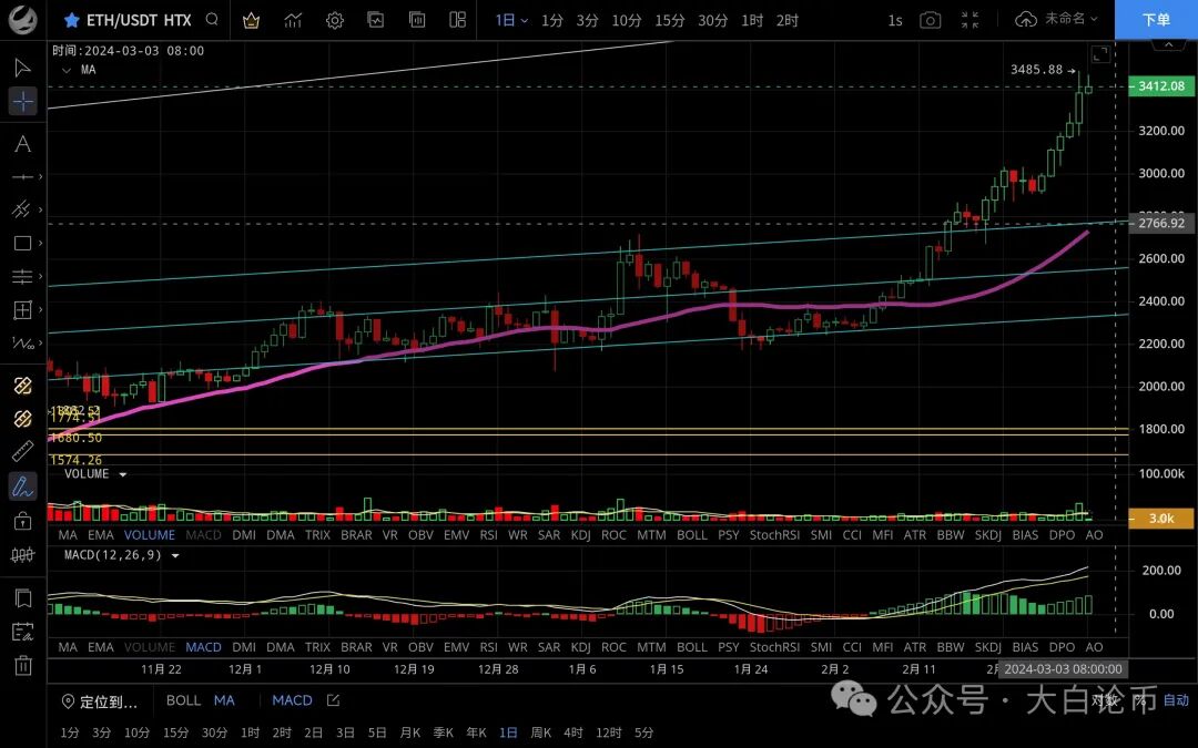 以太坊昨日整体呈震荡上行走势,最高触及3485一线受阻迅速回落,低位跌至3180后再次反弹,恭喜跟上昨日思路的朋友多单获利近300点,目前币价在3394附近运行,四小时级别行情回踩ma14后收针反弹,再次回到ma7均线上方运行,价格二次试探前高但没能突破随后回落,macd多头运行但没有量能整体缓慢上行走势,目前没破前高预计回走一波回踩,下方关注ma7和14日均线支撑,不破则会继续上行,日线级别呈多头排列加速拉升后预计短期会形成顶部,若日线不破新高会维持高位震荡,多头环境下建议顺势而为,虽有插针但不足以改变趋势,思路建议回踩低多为主高空为辅,上方压制3450-3530,下方支撑3330-3250