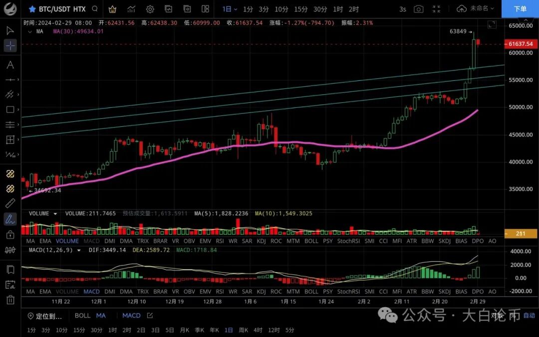 大饼昨日横盘震荡后选择继续上行,多头较为强势最高触及63850一线受阻迅速回落,跌至58700附近支撑,恭喜跟上低多思路的朋友获利7000点,目前币价在61400附近运行,四小时级别行情沿ma7一路上行,虽收十字阴线但回踩没有延续,macd多头运行双线金叉状态,ma均线向上发散,整体走势偏向多头,目前处于高位若不突破新高白盘会维持震荡,日线级别多头逐步放量,k线五连阳突破多个压制,目前日线严重超买需要注意风险,今年预计会一路上行回踩不会太多,20-30点的回调就是进多的机会,思路建议低多为主高空为辅,上方压制63000-64000,下方支撑61000-60000