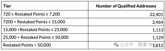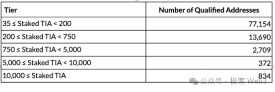 Altlayer空投时采用了分层制,积分分发参考了用户在Celestia主网质押的TIA金额,进行了明确层级划分,你能获得的空投金额,按照你过去在Celestia等网络中质押的存款数额来定,不是看你有多少个账户。但是,单个账户的空投份额还是有限,满足了存款的最低金额后,才能获得奖励,奖励的下限和上限都有明确规定。这本质上是把激励分层化的POS。