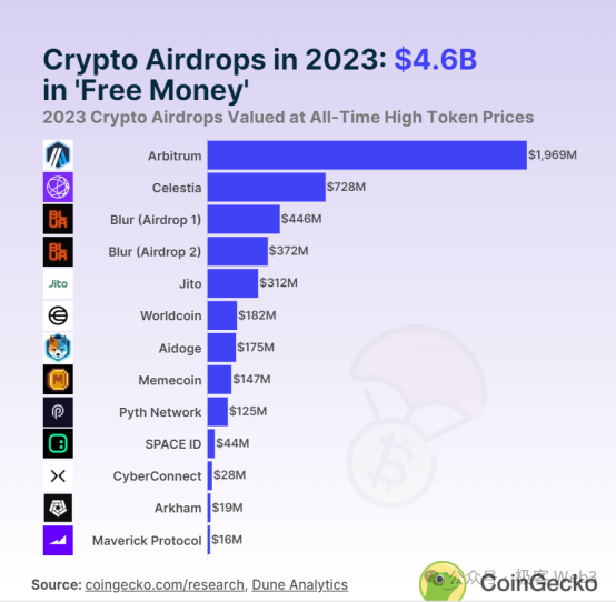 正文:尽管2023年是刺骨寒的熊市,很多项目方还是向用户分发了大规模的空投奖励。熊市中的FreeMoney让用户们趋之若鹜,仅以Coingecko的数据为例,以空投Token的ATH(alltime最高点)价格计算,仅过去一年中,Arbitrum和Celestia、Blur等项目方就向用户分发了大约46.5亿美元的空投。