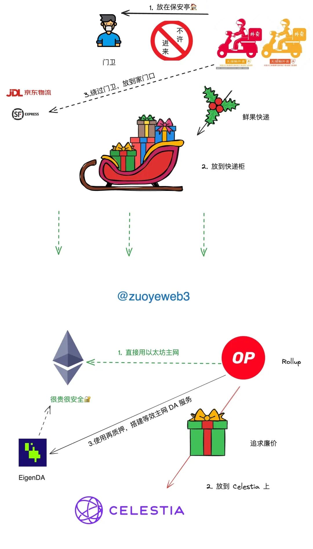 这种更改安全用途并不难理解,现实生活中的保安大爷理论上是维护小区的治安,但是偶尔卡一卡外卖小哥也是理所应当,如果把外卖放在保安亭,其实就相当于进了小区,Rollup 用了 EigenDA 会省钱也是这个道理,如果放在快递柜,那就相当于把 Celestia 当 DA 服务,会更便宜。