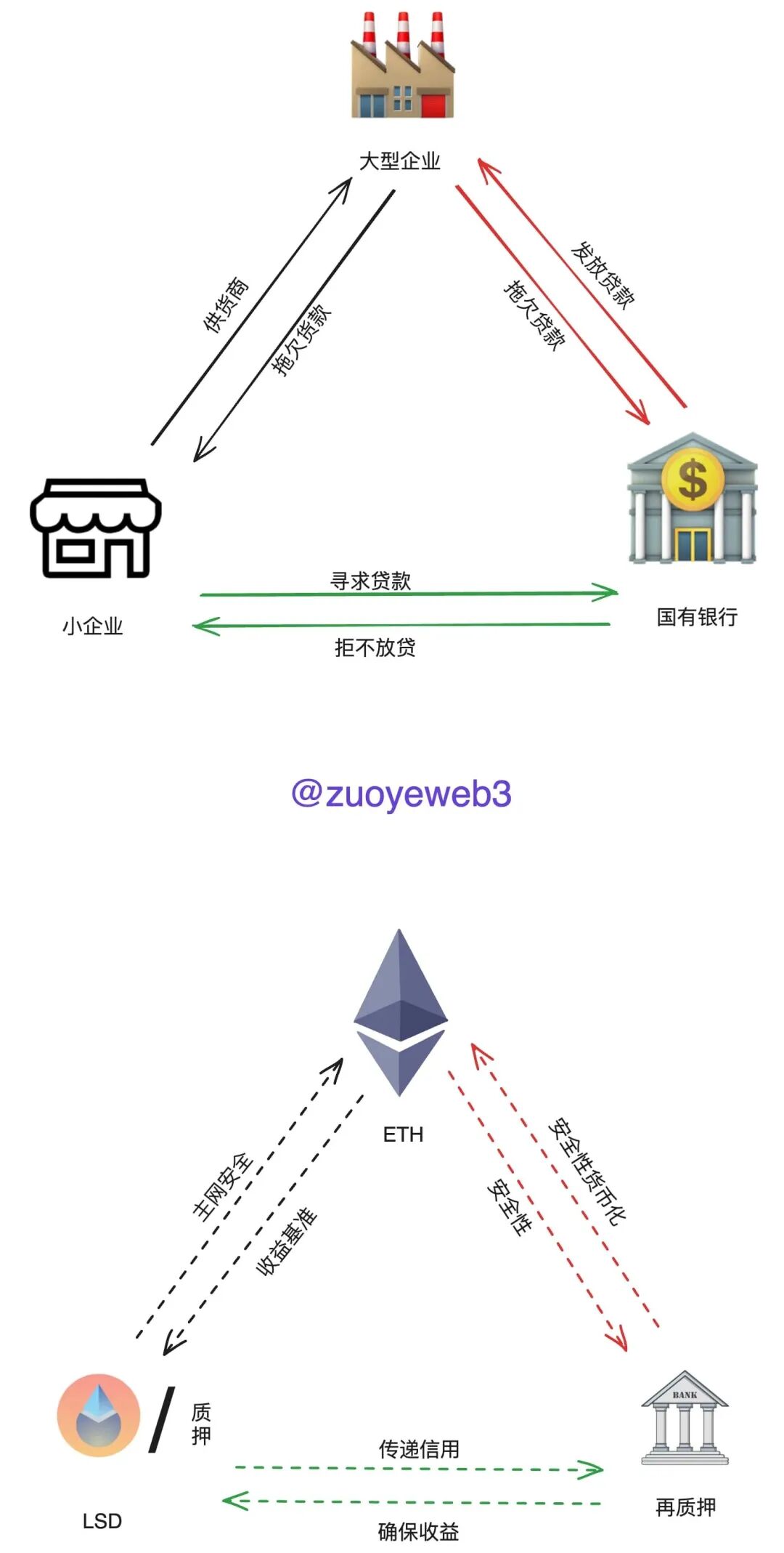 类比一下,ETH 就是大型企业,LSD 是小企业,再质押就是银行,在这个逻辑中,并不是简单的 ETH 杠杆在扩大,而是 ETH--信用凭证--制造代币--反哺 ETH 的循环往复过程,核心秘诀在于整个流通过程的收益率要高于 ETH 质押收益率,否则就会资不抵债,也就是整个债务超越经济增长后,经济增长连债务利息都无法偿还,就更不可能消除债务,目前的美国、日本和欧洲就在这条道路上狂奔,其中美国的情况最好,因为美元的代价通胀每一个人都要承担,你有 USDT 就要承担。