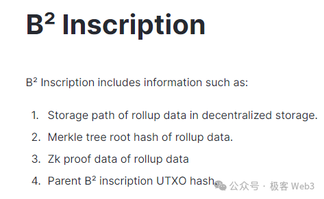 B^2 Hub中存在名为Committer(承诺人)的可轮换角色,它会把Batch的数据hash(其实是Merkle root),以及存储索引,以铭文的形式提交到比特币链上。只要你读取到这个数据hash和存储索引,就有办法在链下的DA层/存储层获取到完整的数据。假设链下有N个节点存放着Batch数据,只要其中1个节点愿意对外提供数据,就能让任何人获取到它需要的数据,这里的信任假设是1/N。