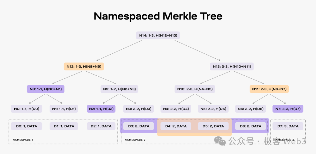 轻节点仅凭区块头,自然不知道Merkle Tree的全貌,不知道新增数据都有什么,无法验证数据是否有问题。但轻节点可以向全节点索要树上的某个叶子leaf。全节点会按照要求,把leaf和对应的Merkle Proof,一并提交给轻节点,让后者确信,这个leaf的确存在于Celestia区块里的Merkle Tree上,而不是被节点凭空杜撰出的虚假数据。
