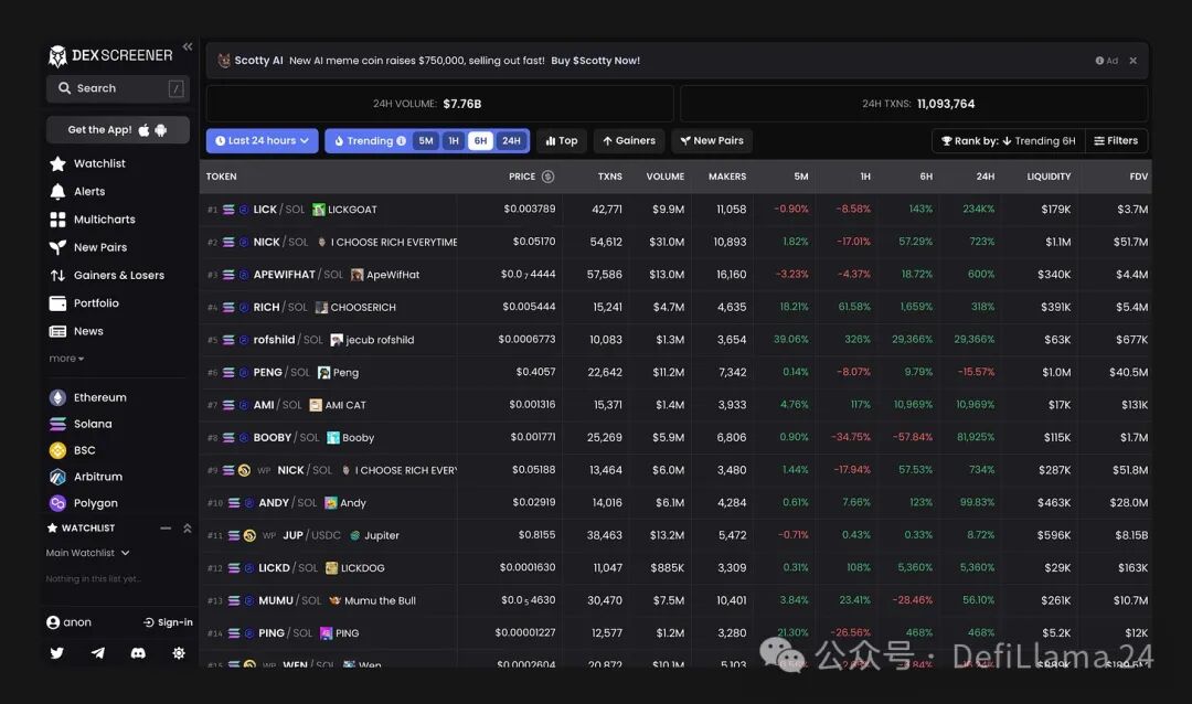 “把赌注押在零售业”这句谚语是正确的——而零售业的代表就在 Solana 上。 所有趋势代币都是 DEXSCREENER 上的 Solana memecoin