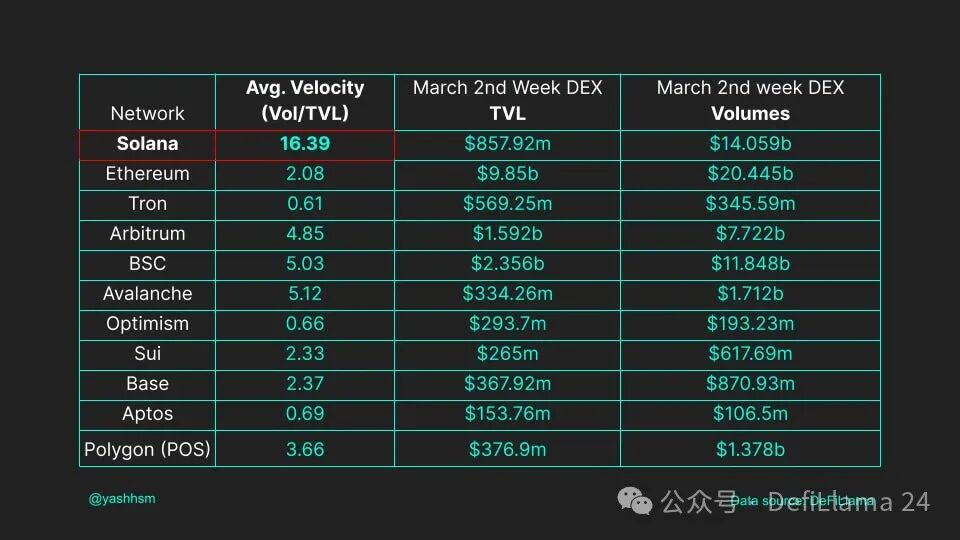 从去年开始流行,而 TVL 可能是一个虚荣指标;DeFi 速度(每日 DEX 交易量/链的 TVL)是 Solana DEX 真正占据主导地位的一个指标。