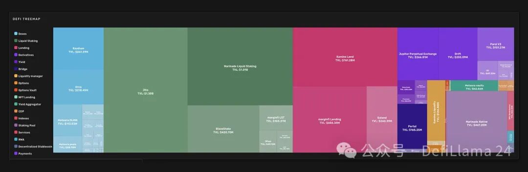 就像其他任何 DeFi 生态系统一样,Solana 拥有广泛的分支,大部分 TVL 贡献来自 LST、DEX、借贷平台和 Perps。