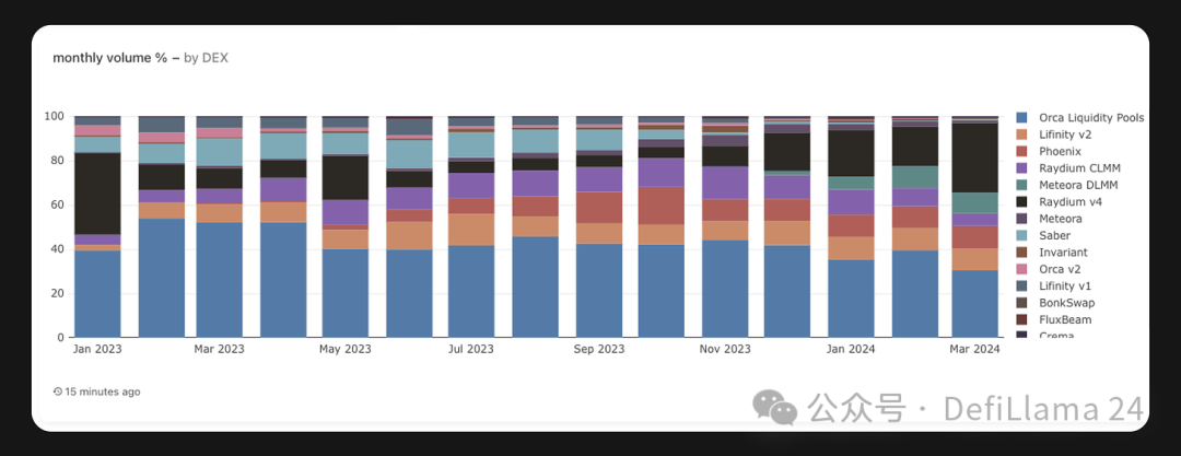 与 Uniswap 占据主导地位的 EVM 生态系统不同,Solana 的现货 DEX 仍然具有高度竞争力,顶级 DEX 激烈争夺市场份额。Orca 在年初占据了超过 50% 的市场份额,尽管市场份额略有下降,但仍然是领先的 DEX。Raydium 和 Openbook 的销量非常可观,尤其是在 meme 币流行期间。 Solana DEX 之间争夺市场份额的激烈竞争