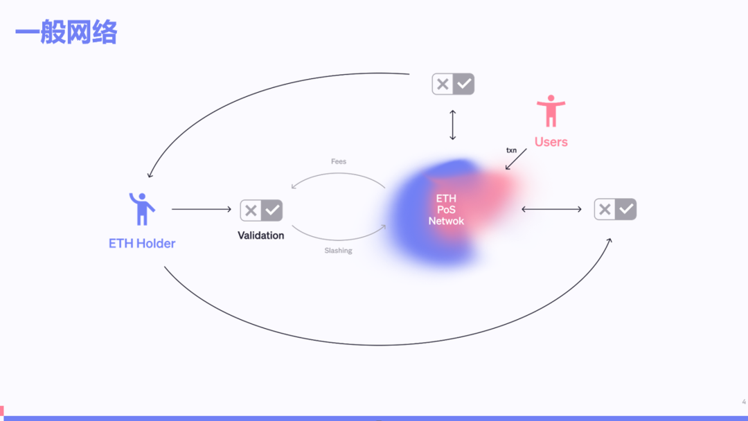 假设一个 ETH 持有者拥有 100 ETH 并希望通过质押获得 10% 的收益。他们将 ETH 存入一个质押合约,如 Lido,并同意以太坊的罚没规则,例如发送相互矛盾的消息(equivocation)和双签。这样,他们支持 Lido 验证器并获得 10% 的收益,但也可能面临罚没。