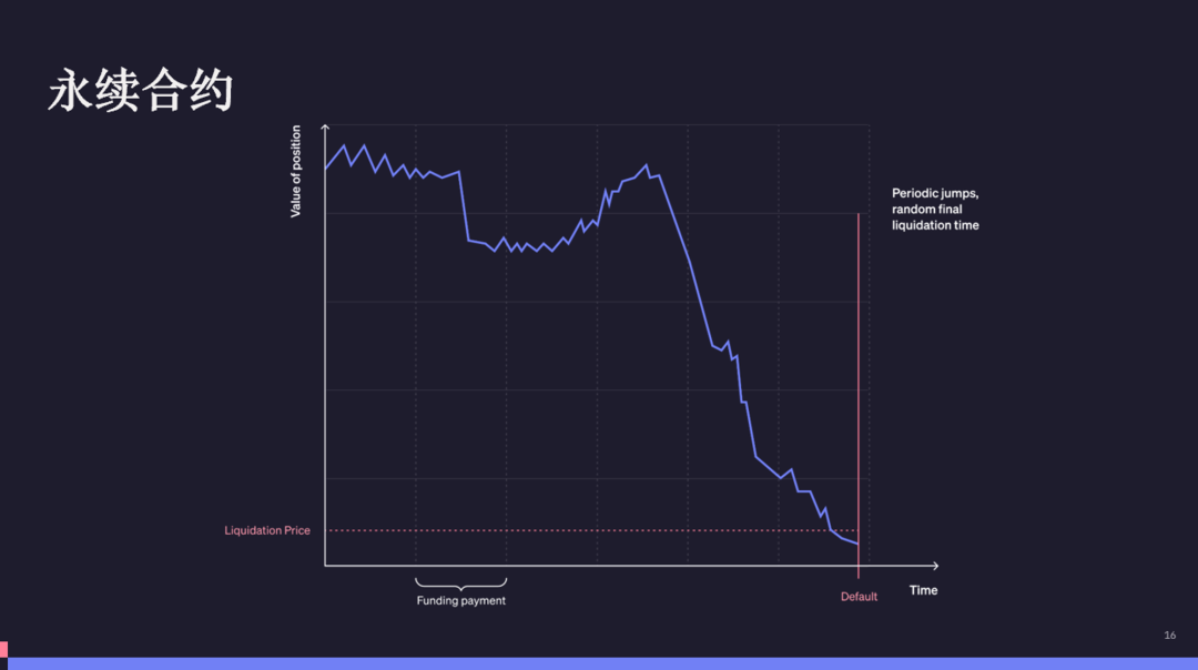 然后我们来考虑永续合约的情况,无论链上还是链下的永续组件,都有这种周期性的资金利率更新,但可能不容易看到这些资金支付时间。多头和空头之间的净支付,或者空头到多头,会导致持仓价值的变化,所以你有这种周期性的跳跃,这些时间节点是几乎接近违约(default)的时间节点。