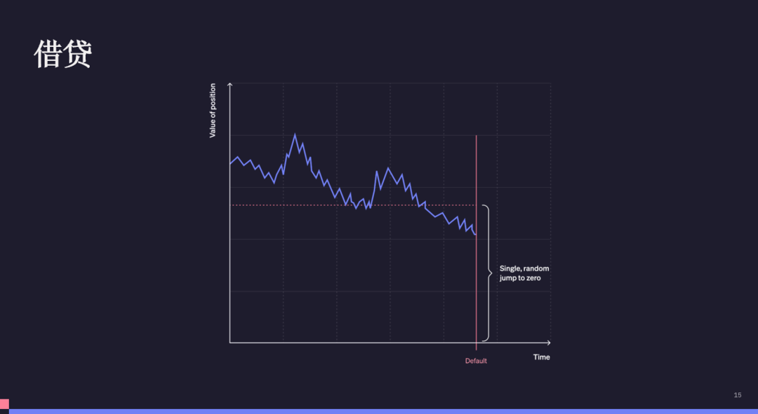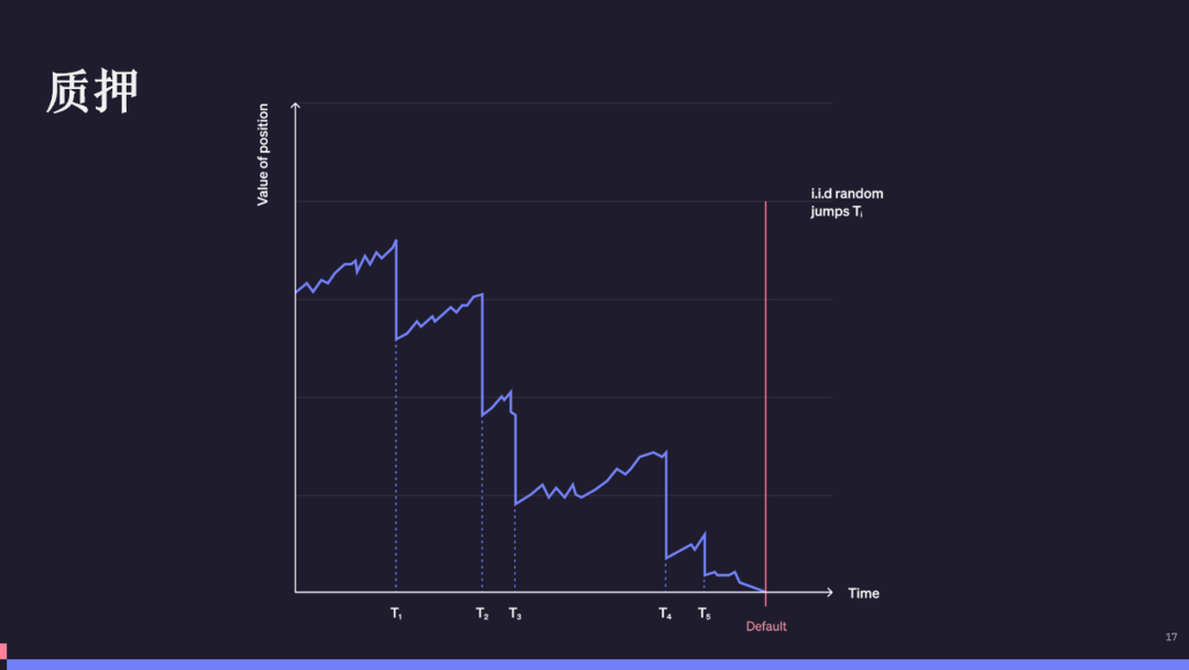在链上借贷中,违约是一种指示函数跳跃至零的样式,你有一个头寸的价值,它低于某个清算阈值,然后跳跃至零。但这种跳跃是单一的,并且是一个随机时间,所以它是一个根据实际过程而定的随机停止时间,一次归零。