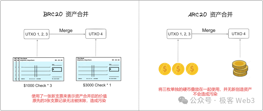 - ARC-20交易索引在资产合并方面比BRC-20交易索引更方便。我们可以简单理解为:BRC-20的资产合并是将3张$1000价值的支票,用新的一张支票写入$3000价值来代替,但原先的3张支票理论上要被销毁,但因为已被记录到链上,无法直接抹去,从而造成数据污染;很多时候从交易所提币总会遇到一些莫名其妙的铭文。