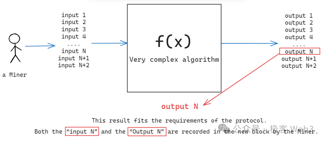 我们先看下比特币挖矿的原理:挖矿者在本地不断的向一个给定算法,提供不同的输入值,尝试让输出值符合比特币协议的要求。矿工可能因为撞大运,得到了符合条件的结果,此时所对应的输出值和输入值,就作为“投名状”,写进区块里,当做获取挖矿奖励的筹码。接下来,只要这个新区块被网络中绝大多数节点认可,挖矿者就可以获取BTC 奖励。