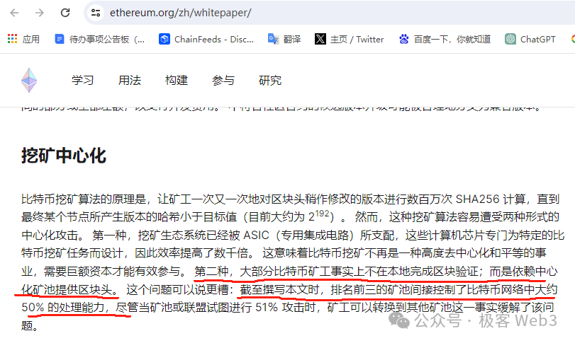 很显然,残酷的排他性竞争不利于个体矿工的生存,很多小矿工最终会把矿机贡献给大矿池,由后者作为一个聚拢大量算力的“整体”,与其他矿池展开竞争,毫无疑问这会让比特币网络内的算力呈现出高度集中化的倾向,这一点甚至在以太坊白皮书中都有明确提及。
