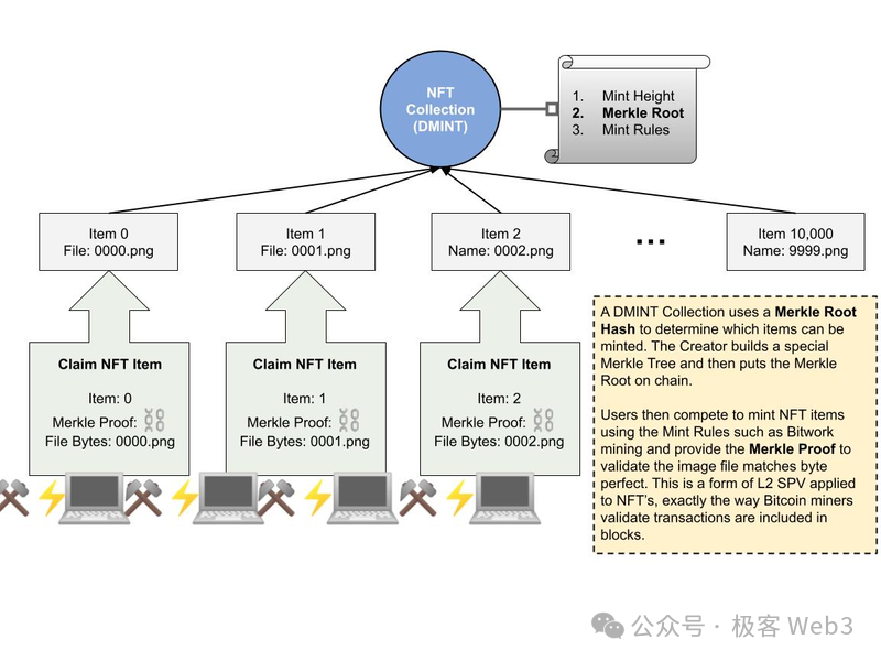 对NFT 项目方而言,工作重点可以集中在NFT 发行前的准备工作,需要归集所有NFT 的数据、配置Dmint数据等。同时,遵循Dmint协议的NFT 发行方,会把全部的NFT 数据汇总构建成一棵Merkle Tree,这棵树的Merkle root会发布在链上,完整的NFT 元数据则都保存在链下。
