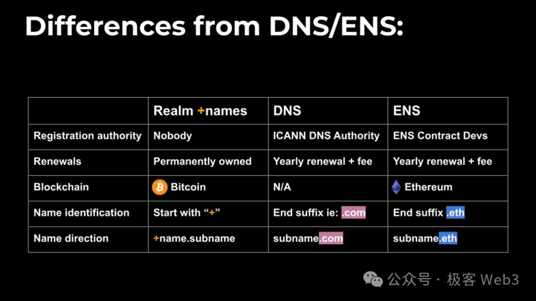 Realm的名称以 加号+开头,并且至少有一个字母字符,例如+alice和+agent007,它们都是有效的DID标识符。对比传统域名以及ENS来说,Realm在保留去中心化的前提下,具有更高的可扩展性和灵活性。