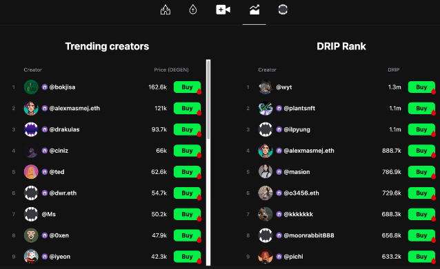 近期热度较高的sofi项目还有Web3 Tiktok Drakula,直播平台Unlonely等。Drakula是一个Web3短视频发布平台,用户可以上传发布自己的视频或观看别人的视频,平台积分Drip可以通过制作视频,分享邀请链接,完成平台任务或者买其他创作者的token获得,同时也可用于打赏其他创作者。与FriendTech类似,平台上的创作者有自己的代币,以Degen计价并且越受欢迎的创作者代币单价越高,用户可以从平台上查看最受欢迎的创作者(代币价格更高,收到的打赏更多)。