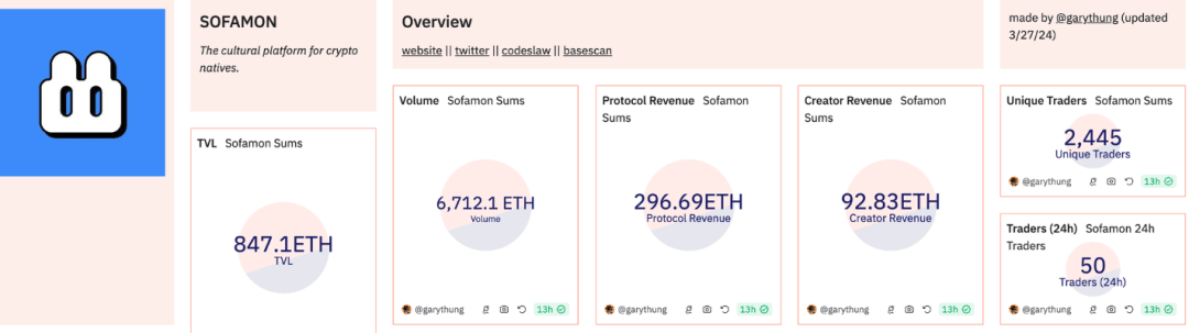 Telegram贴纸金融化平台sofamon,目前正在做一个 Telegram 上的个人聊天贴纸市场,用户可以管理自己的贴纸集、邀请朋友、访问 Sofamon 的私人群聊等。与Friend.Tech类似,每一个贴纸配件都具有价格曲线,越早购买者价格越低,在后续购买者进入将价格推高后买出获利。在上线不久后,Sofamon交易额已经接近7000ETH ,协议收入也近300ETH 。