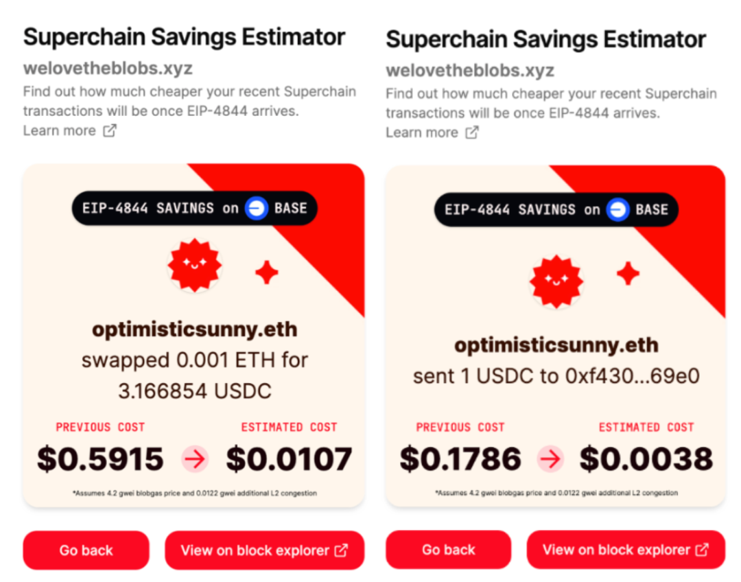 随着坎昆升级的完成,L2从中得到了极大的受益。坎昆升级中与L2最为有关的是EIP4844提案,EIP-4844 引入了一种新数据存储结构:Blob,专门用于存储 L2 向 L1 提交的交易数据。引入后,L2 的交易数据直接提交至 Blob 中进行存储,可供共识节点完全下载,仅在短暂延迟后即可删除,降低没必要的存储负担。这意味着 Blob 的引进将会极大的降低 L2 的交易费用。同时,Blob 还相当于为 L2 额外拓展了区块空间,同时 L2 交易吞吐量也将显著提高。EIP-4844 本质是一次过渡性的升级为未来做准备,以实现完全的 Danksharding(以太坊「宁静」阶段升级的最后部分)。以太坊主链上提供数据可用性是 Calldata(可以理解为合约交易调用中产生的数据),而 Layer 2 回传到 Layer 1 的数据都存储在 Calldata 里,另外为了安全,Calldata 每一步执行都需要 Gas,这就造成了 Gas 花费较大的情况。但 Calldata 中的交易数据验证完后其实是没有太多用途的,长时间的数据也可以下载验证,甚至不需要传到执行层,在坎昆升级前,以 OP 链的平均交易费用历史构成举例,近 80% 的费用都来自 L1 的数据费用。以Base链上交互的成本为例,坎昆升级前后swap的gas费用由0.59美元降低至0.01美元,约为之前费用的1.6%,发送功能的gas费用由0.178美元降低至0.003美元,约为之前费用的2%。EIP4844使得base的费用在网络较为空闲时降低至可以与solana抗衡的水平。