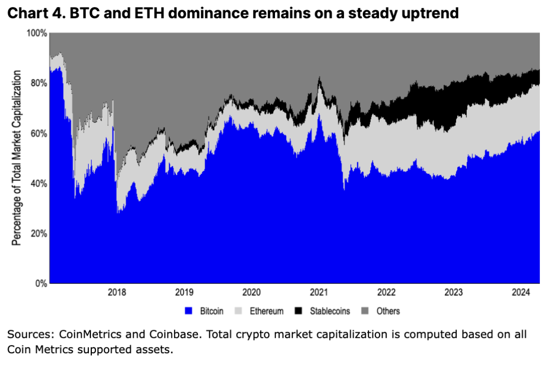短期内,我们预计比特币的主导地位将保持在较高水平,因为更广泛的宏观环境将更多地规避风险,并且通过 ETF 注入的流动性不太可能转向更高贝塔值的资产。