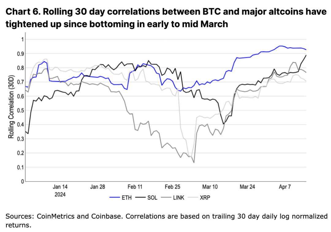 也就是说,我们认为短期活动更有可能受到宏观因素的推动,尽管加密货币基本面总体依然强劲。这些因素在很大程度上是加密货币的外生因素,包括地缘政治紧张局势加剧、长期利率上升、通货再膨胀和国债上升。事实上,最近山寨币与 BTC 的相关性上升凸显了这一点,表明 BTC 在该领域的锚定作用,尽管 BTC 巩固了其作为宏观资产的地位。