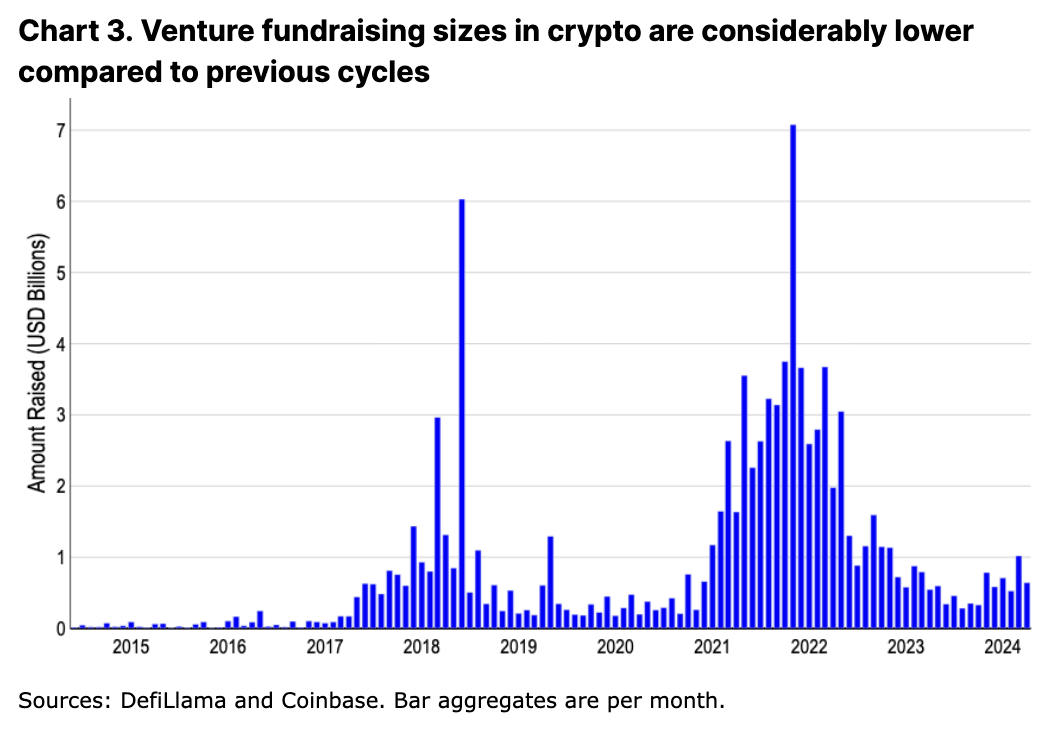 加密货币融资的低迷水平(相对于之前的周期)支持了这一观点。它减少了高贝塔资产新流动性的主要途径。 2024 年的平均筹款金额仍低于每月 10 亿美元,甚至低于 2017-18 年的水平,约为 2021-22 年的四分之一。资金的减少既是先前周期严重影响的副产品,也是宏观回调的一部分。 2023 年私募市场普遍萎缩,风险投资基金筹集的资金总额创 6 年来 最低水平,自 2022 年以来下降了 60%。