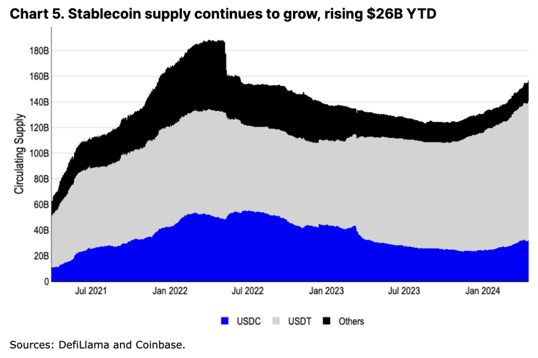 除了我们之前详细介绍过的比特币减半之外,市场正在寻找新的催化剂来维持由美国现货比特币 ETF 批准引发的 24 年第一季度的涨势。稳定币发行量的持续增长和 DeFi 协议锁定总价值(TVL)的增长表明链上活动持续强劲。与此同时,第一层 (L1) 和第二层 (L2) 层面的持续平台创新,加上改进的钱包工具,以提供更好的用户体验,构成了我们认为在未来几个月最相关的一些叙述的基础。
