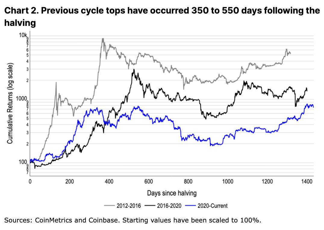 事实上,我们认为,通过现货 ETF 增加获得更广泛资本基础的机会,加上新的供应方动态,对于该资产类别具有长期建设性作用。然而,如果之前的周期有任何迹象的话,这可能需要几个月的时间才能完全实现。减半后的顶部发生在事件发生后 350 至 550 天之间(参见图 2),尽管这个周期时间已经不同了。在现货 ETF 流入的背景下,比特币在减半前一个多月达到了历史新高,我们预计比特币将进一步偏离之前的时间趋势。