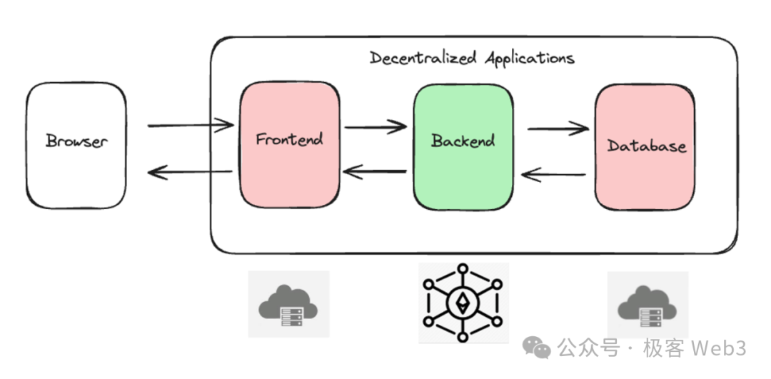一般情况下,一个去中心化DAPP会包含前端界面、后端服务器、数据库。用户访问前端界面时,会通过浏览器和域名服务来加载前端内容。其中: