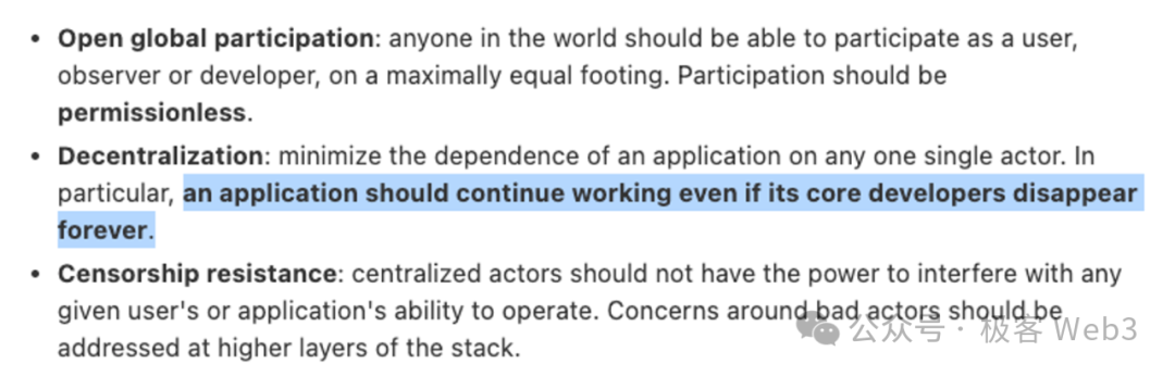 2023年末Vitalik回顾以太坊的发展,写了一篇反响较大的文章“Make Ethereum Cypherpunk Again”,讨论了以太坊社区该如何回归密码朋克的理念。他在文中总结了以太坊甚至是更大范围的Web3社区应该坚守的价值观,提到非常重要的一点: