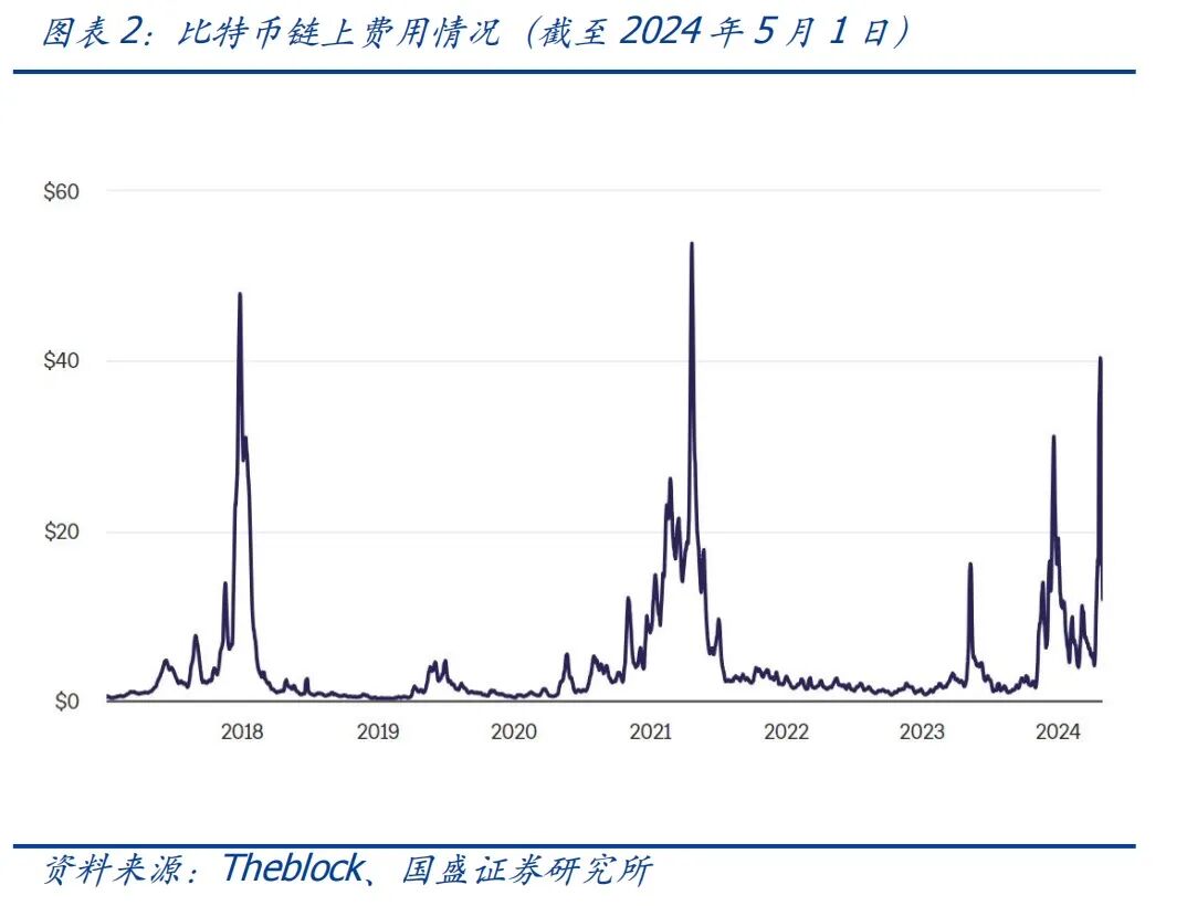 区块链的工作原理需要分散的节点达成共识、确认,这必然带来效率的下降,所以在处理任务(转账或执行合约程序)的时候自然不如中心化节点快,这是一个典型的不可能三角问题(安全、可扩展性、去中心化不可同时最优)。站在提升扩展性的角度,二层网络(Layer2,L2)是一种广泛采用的方案。近几年以太坊L2迅速发展下,生态繁荣下的以太坊链上费用得到了整体的控制,而比特币网络生态发展还十分初级, 2023年的铭文、今年符文等活动带来的链上交易活跃,即可看到比特币网络的费用有个急速攀升的过程(见图2)。