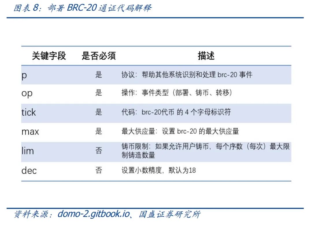 BRC-20起源于一个社区实验,是比特币生态的一次尝试。2023年3月9日,推特用户domodata在gitbook上发布了其称之为“有趣且具有实验性的标准”的BRC-20标准,它基于Ordinals协议创建,可以将铭文设置为JSON数据格式来部署通证、铸造和转移通证。简单来说,就是damodata认为Ordinals协议不仅仅可以用来发行NFT,当铭文按照JSON数据格式附加时,就可以用来发行通证。所以,BRC-20通证可以理解为是一种变异的Ordinals NFT,NFT上铭文刻录的是图片,但BRC-20上铭文都是统一的JSON格式的文本数据。BRC-20主要为比特币网络发行同质化通证提供了3个标准,包括BRC-20通证的部署(deploy),铸造(Mint)和转移(Transfer),开发者按照这个标准执行就可以完成BRC-20通证的创建和发行。在gitbook主页中,domodata也给出了部署、铸造和转移的示例。