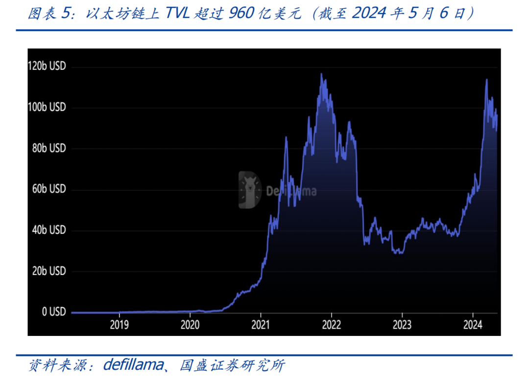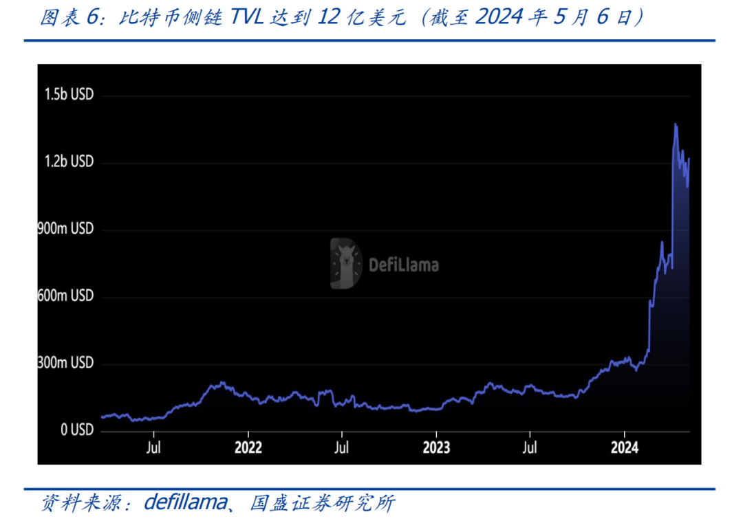 随着Ordinals协议催生了铭文、符文等应用,进一步推动了比特币生态的发展。截至5月6日,以太坊生态TVL超过960亿美元,比特币生态在过去一年经历了较快的发展,TVL已达12亿美元。毫无疑问,相较于以太坊,比特币生态的发展还处于初期。