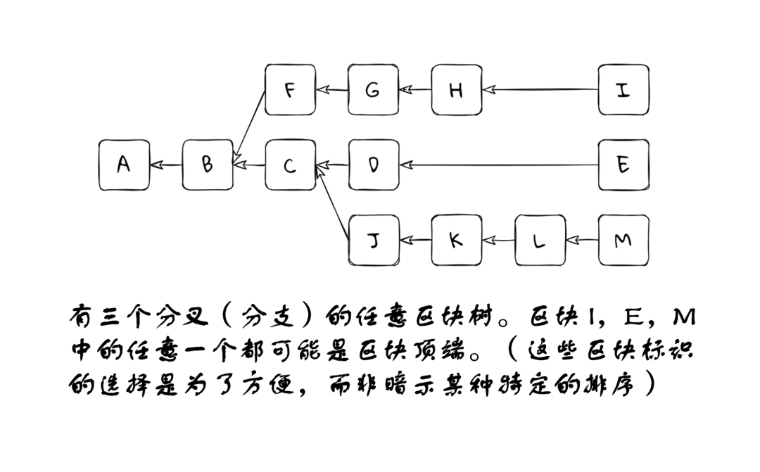 请将这个区块树看作是由某种底层共识机制产生的,无论是工作量证明还是权益证明中的 LMD GHOST。
