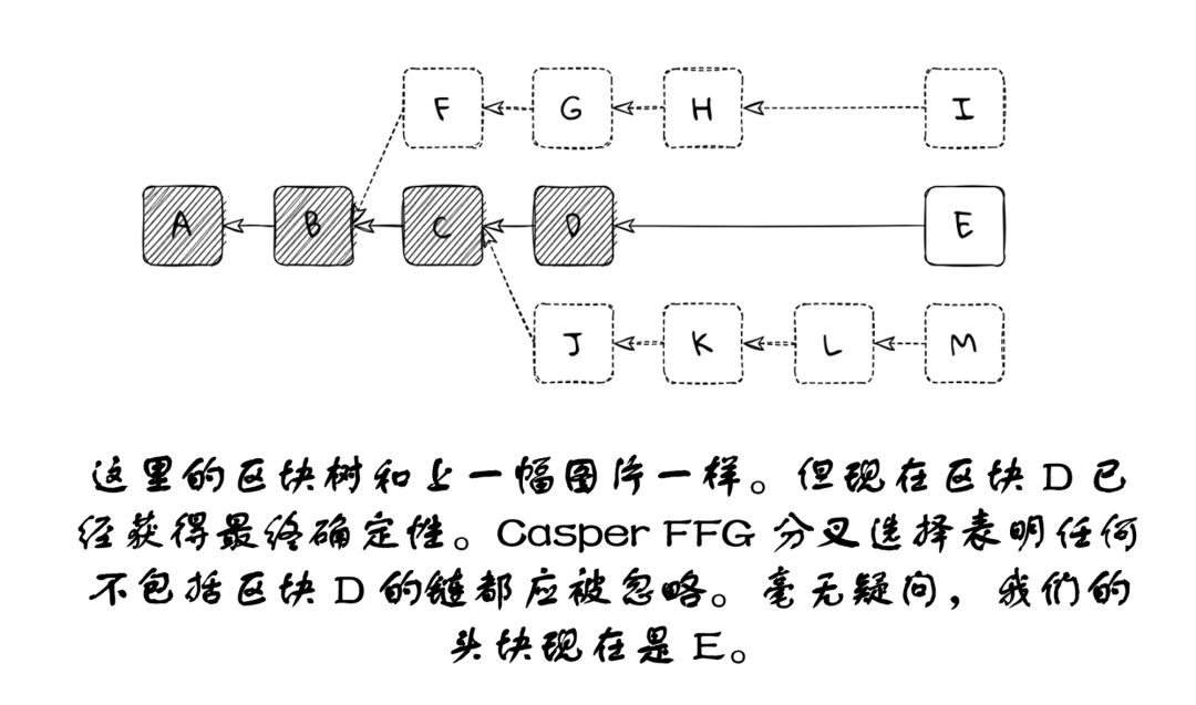 当区块 D 被最终确定,分叉选择必须忽略以区块 F 和区块 J 打头的分支。我们最后只保留了一个候选头块:E。