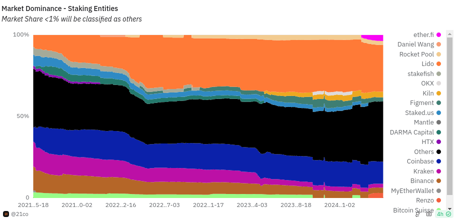 如今,单独的质押者在所有以太坊质押中所占的比例相对较小,并且大多数质押是由各种提供商完成的 —— 一些中心化运营商和其他 DAO,例如 Lido 和 RocketPool。