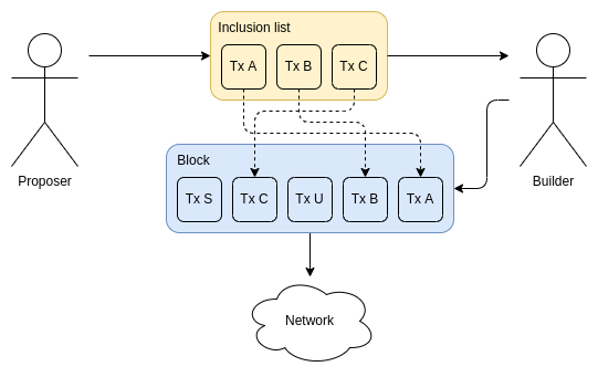 包含列表允许区块提议者(即利益相关者)选择进入区块所需的交易。构建者仍然可以重新排序交易或插入自己的交易,但它们必须包括提议者的交易。最终,修改了包含列表以约束下一个区块而不是当前区块。无论哪种情况,它们都会剥夺构建者将交易完全推出区块的能力。