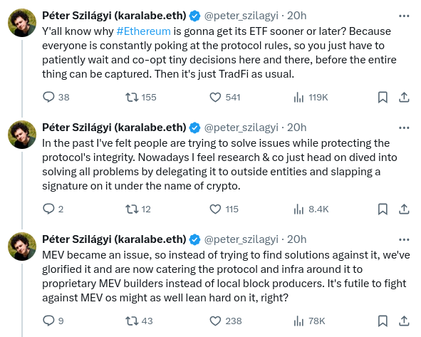 鉴于技术能力的增强,需要提出的一个重要问题是:我们是否正在朝着正确的目标前进?长期的 Geth 核心开发人员 Peter Szilagyi 最近发布的一系列不满的推文促使我们思考这个问题: