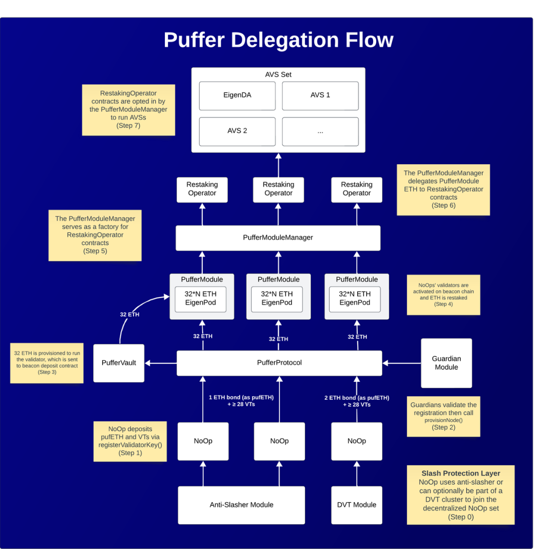 NoOps 通过购买验证者票据 VT 和支付 1 ETH 作为抵押品来加入 Puffer 节点模块,节点运营者通过提前购买 VT 获得运行验证器的权益,同时在进行验证时可保留 100% 的 PoS 奖励;NoOps 通过加入再抵押模块并将验证者的 ETH 委托给再质押运营商作为抵押品,赚取更多收益。