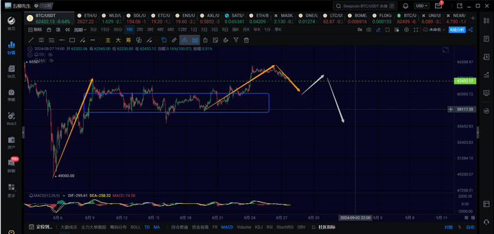 4小时级别:方向向上,重新跌破60500才能确认4h级别反弹结束,目前只是初步预估有4h回调的倾向