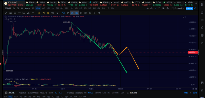 1h级别,当前1h级别回调到62200附近是否已经结束了,短线暂时没看到明显结束的信号,所以倾向于有可能还会再往下走走,比如到61000或者60000附近。重点观察下一笔1h级别反弹的力度,只要拉不上64500上方,则还会有第三笔1h级别的下跌。
