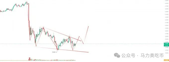 Ton,可以现价5.34附近开多或者买入现货,虽然创始人被抓了,但是社区共识依然很强,也是一个强势板块,主要小级别走了一个下降楔形,也是反转形态,可以博一个突破。先看6u